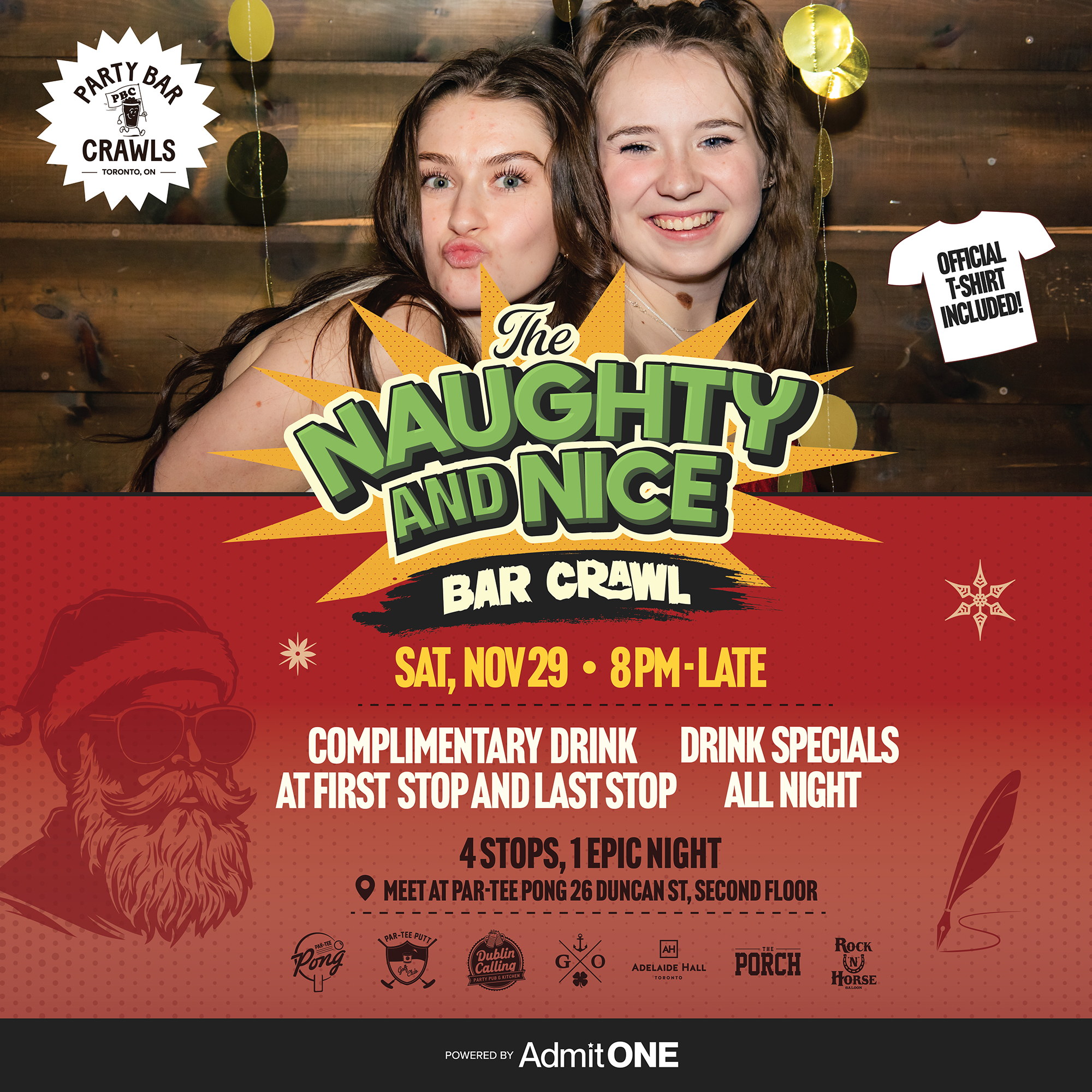 It’s finally time for the Naughty & Nice Bar Crawl—and whether you’re rocking halos or devil horns, this holiday party is bringing the heat early. Red and green fits, festive cocktails, and holiday chaos all night long. 🎁✨